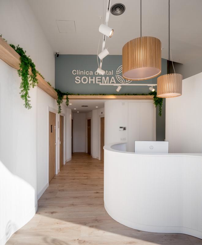 Para ello, se proyectó una distribución que cubriera las diferentes necesidades de la actividad de la clínica. Una recepción con un mostrador diseñado en madera lacada con cajones vistos, una cuidada iluminación con lámparas colgantes de la casa danesa Lightyears, y una pared con azulejos blancos modelo metro. La zona de espera con sillas tapizadas en fieltro gris y patas de madera, hacen acogedor el espacio. Para los niños se planteó un pequeño espacio en el que mientras esperan puedan jugar y pintar en una pizarra; ya que una de las especialidades de la clínica va dirigida a la infancia.