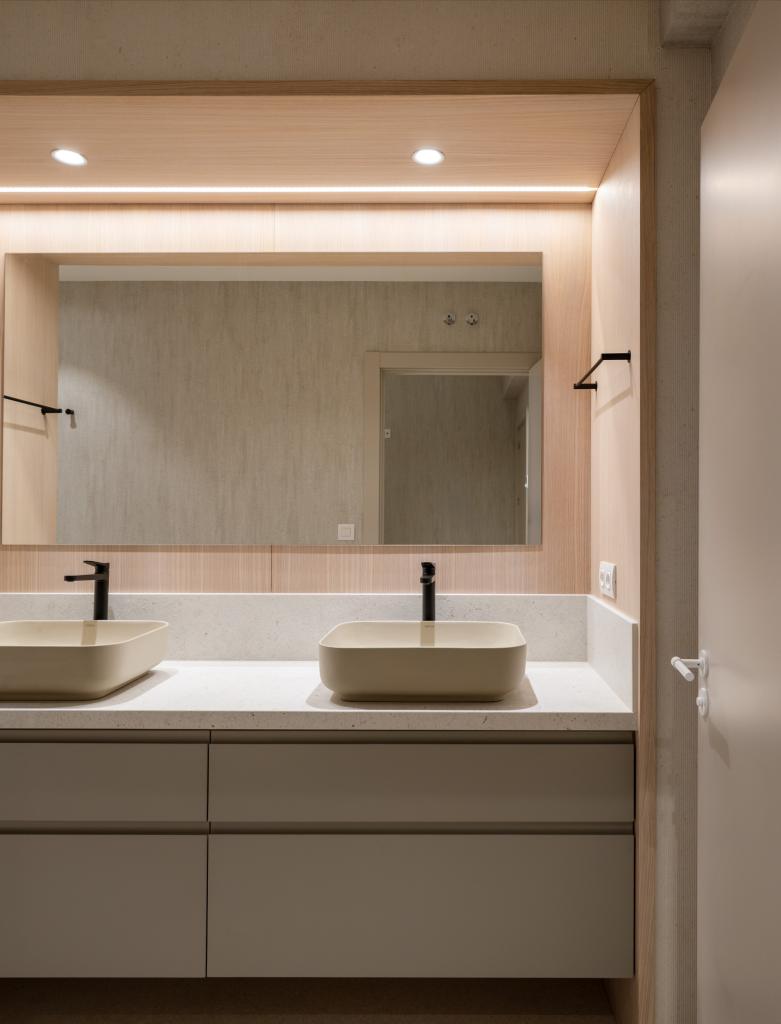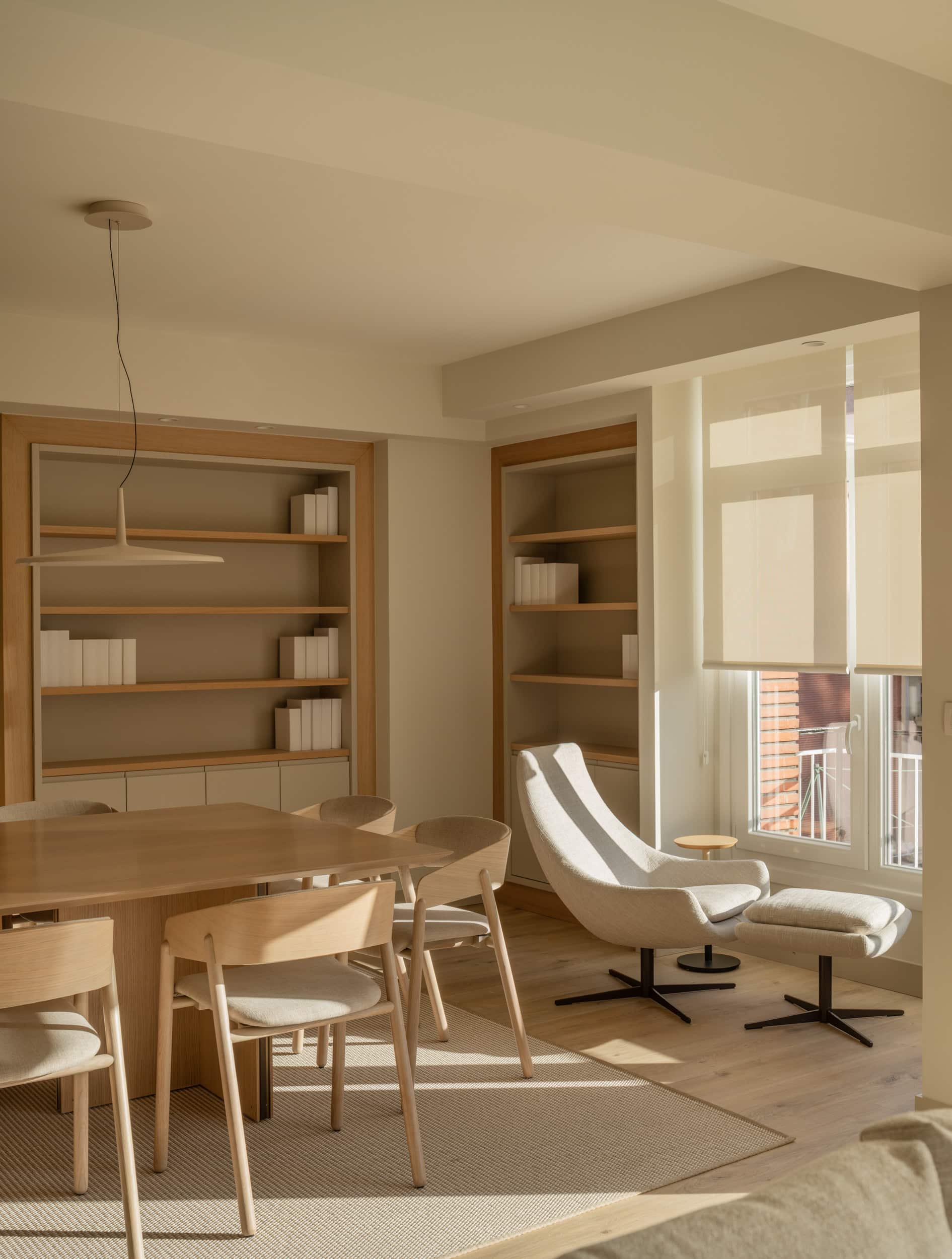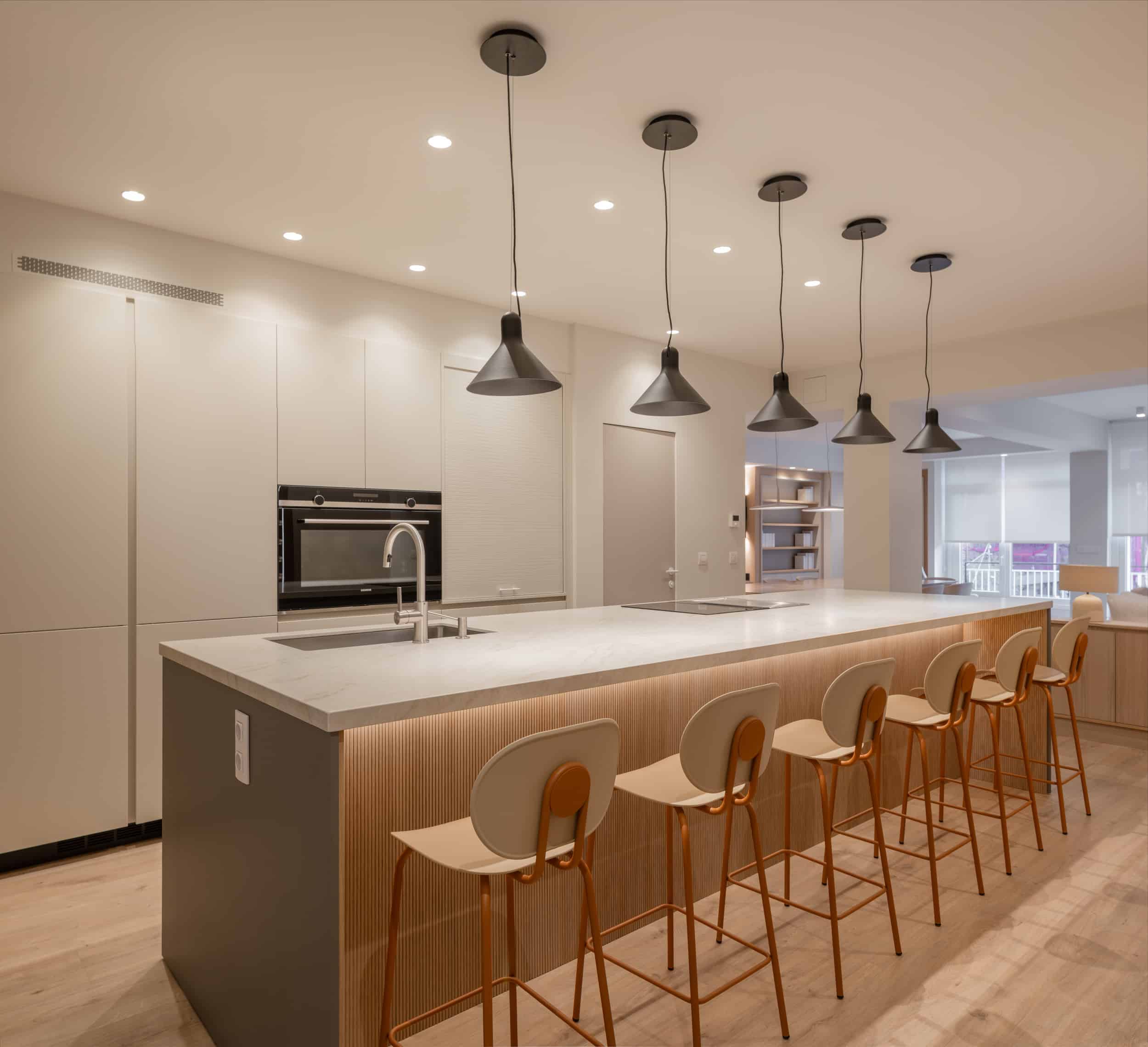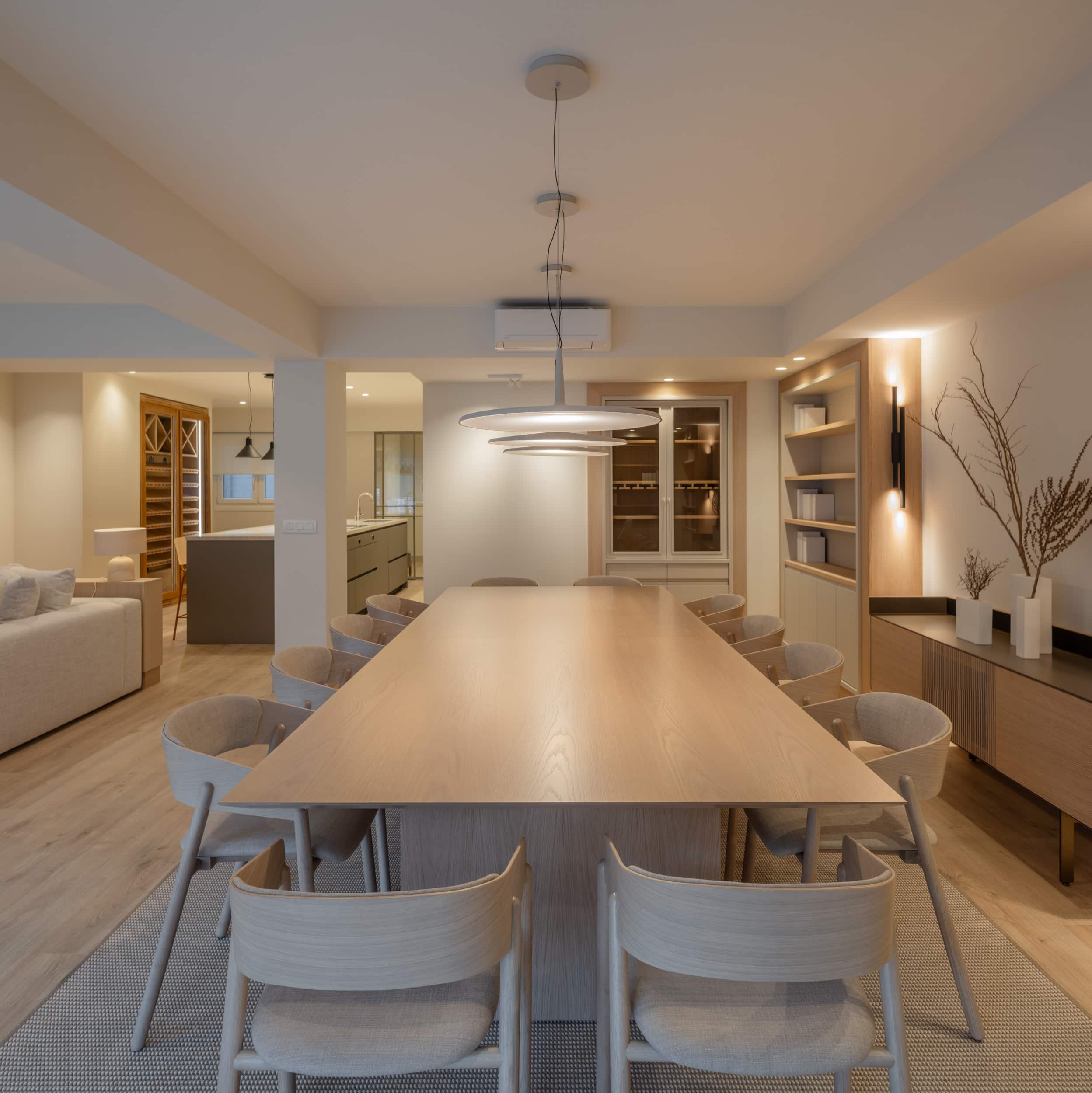 La iluminación fue uno de los ejes clave del proyecto. En colaboración con Susaeta Iluminación diseñamos un plan lumínico que complementa la luz natural y potencia los volúmenes y materiales. Las luminarias empotradas y discretas permiten una luz uniforme general, sin romper la limpieza visual del espacio. Los puntos de luz indirecta, leds cálidos y lámparas decorativas crean ambientes acogedores en salón y comedor. La iluminación puntual en zonas de trabajo —cocina, mesa de comedor, cocina, dormitorios— asegura confort y funcionalidad.