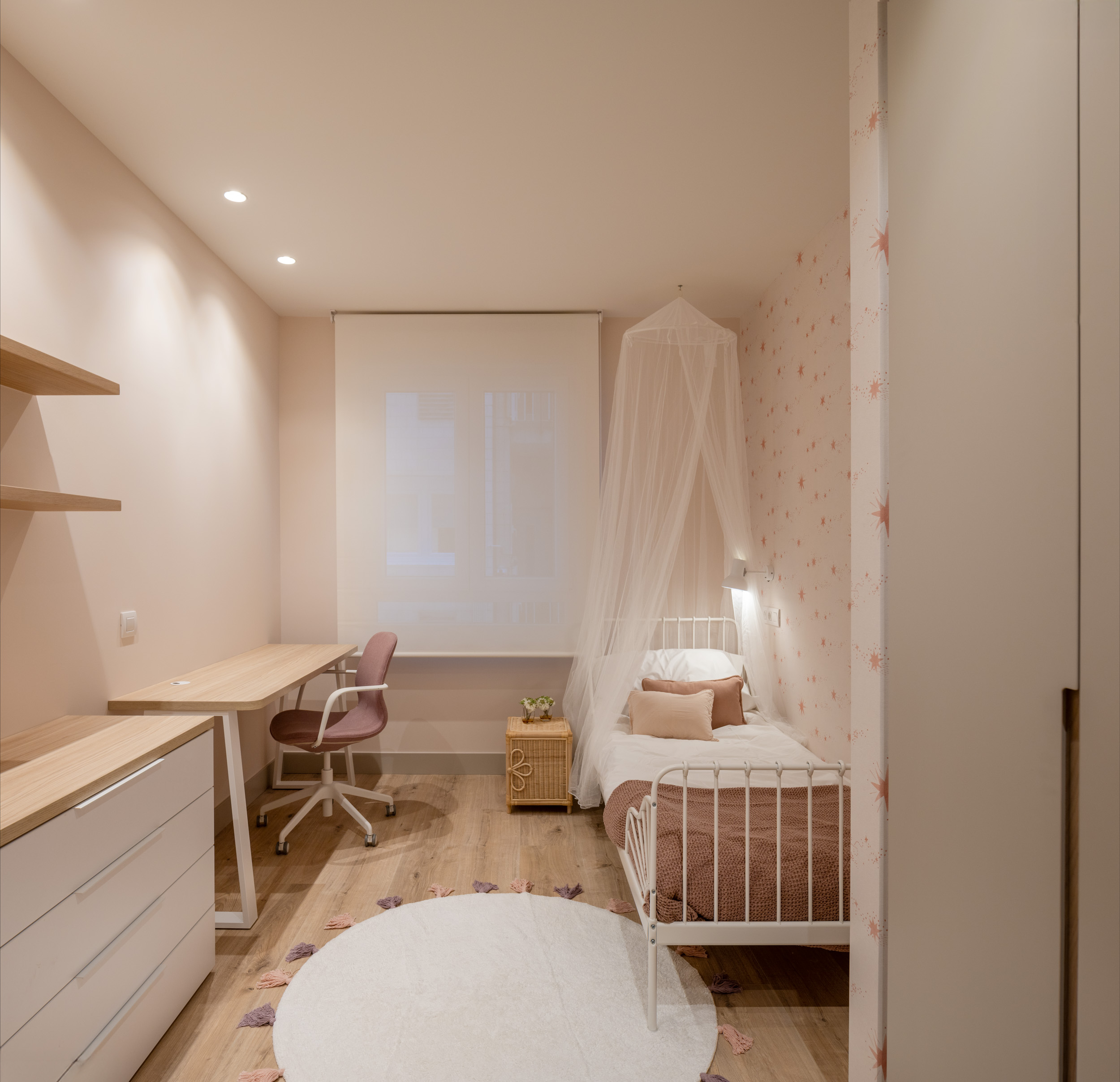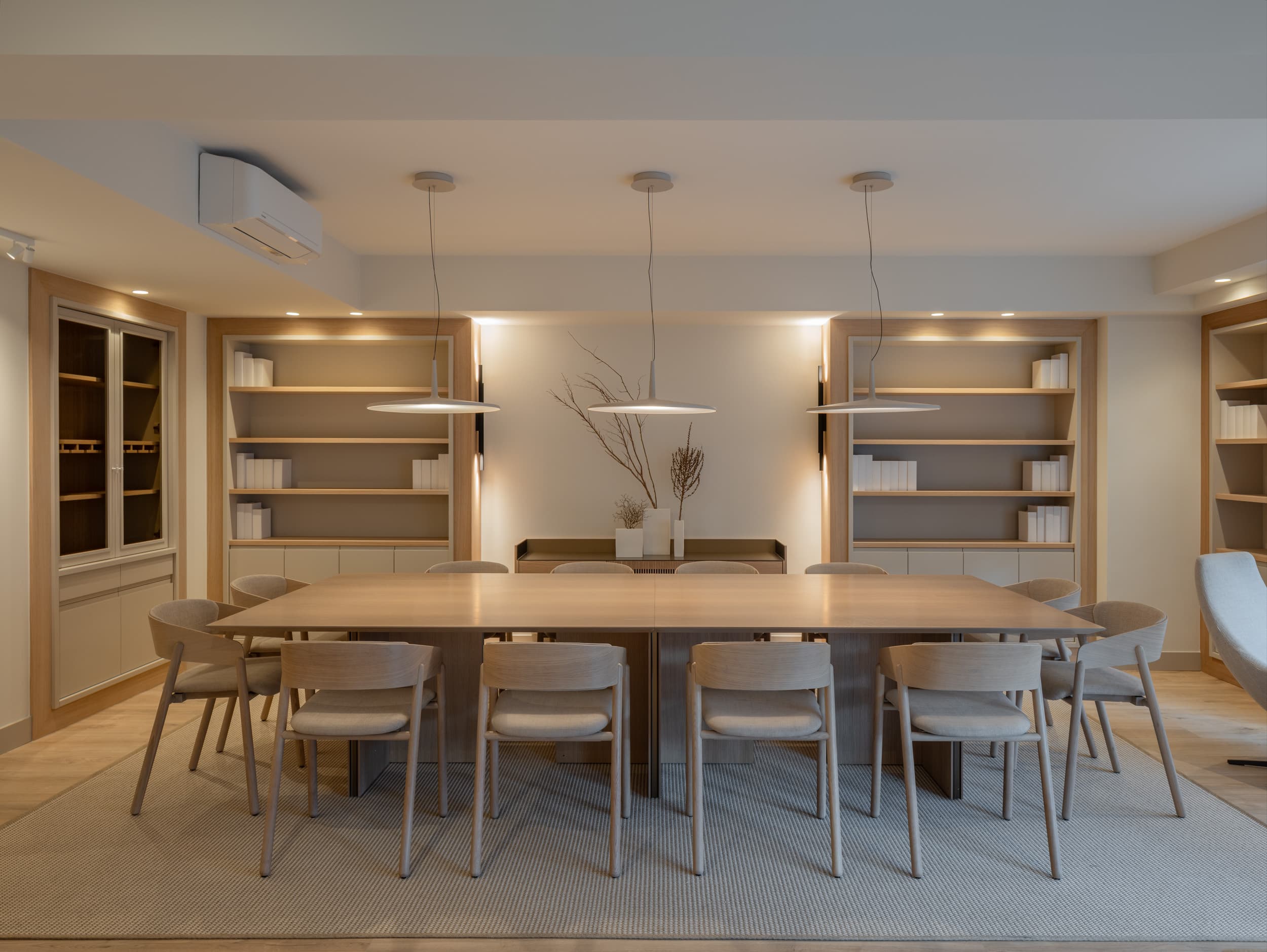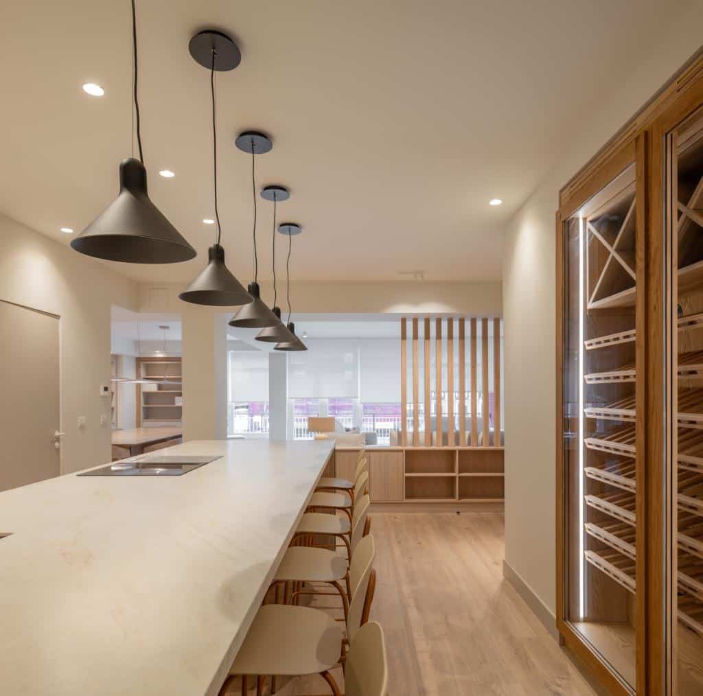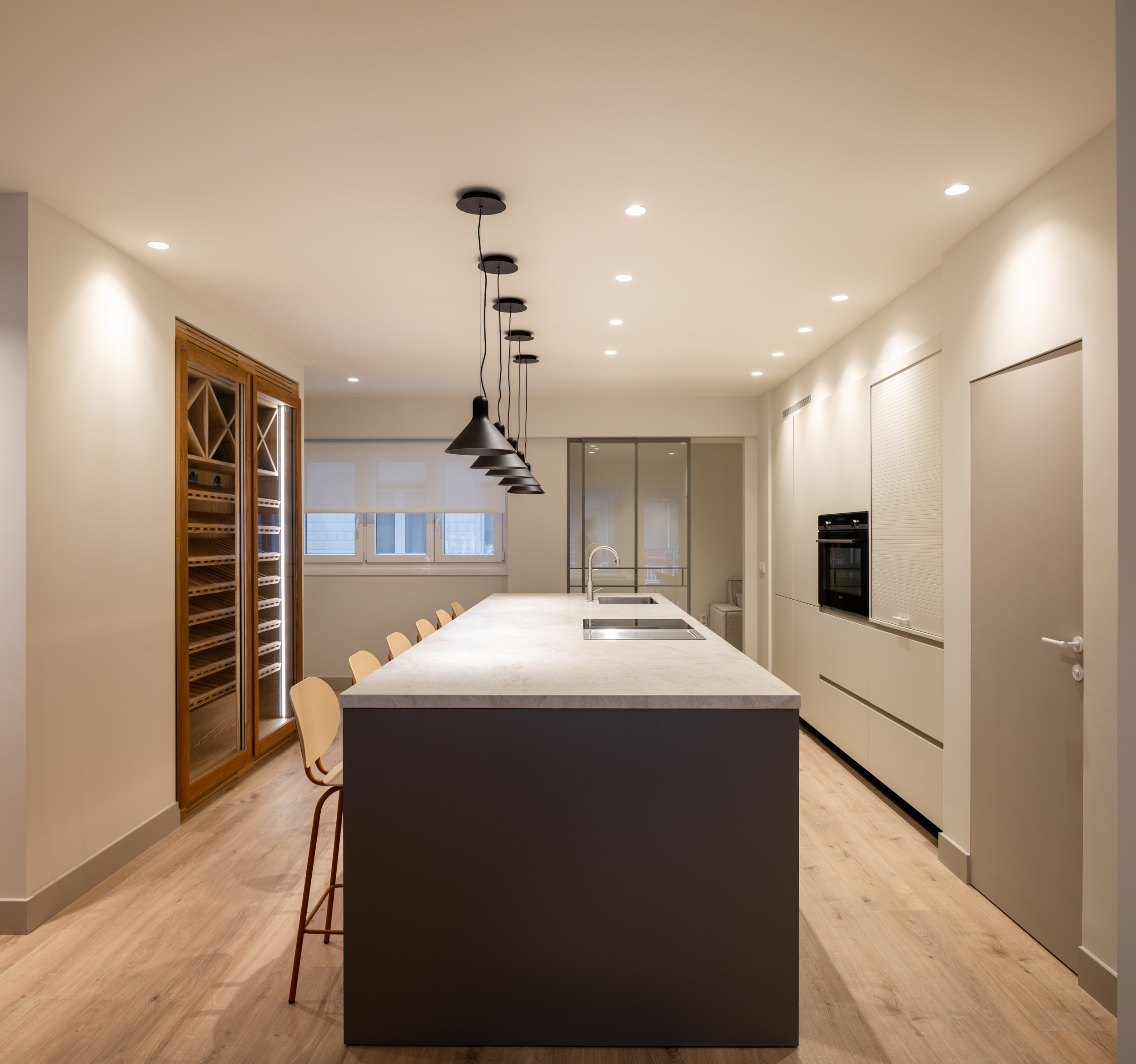 La iluminación fue uno de los ejes clave del proyecto. En colaboración con Susaeta Iluminación diseñamos un plan lumínico que complementa la luz natural y potencia los volúmenes y materiales. Las luminarias empotradas y discretas permiten una luz uniforme general, sin romper la limpieza visual del espacio. Los puntos de luz indirecta, leds cálidos y lámparas decorativas crean ambientes acogedores en salón y comedor. La iluminación puntual en zonas de trabajo —cocina, mesa de comedor, cocina, dormitorios— asegura confort y funcionalidad.