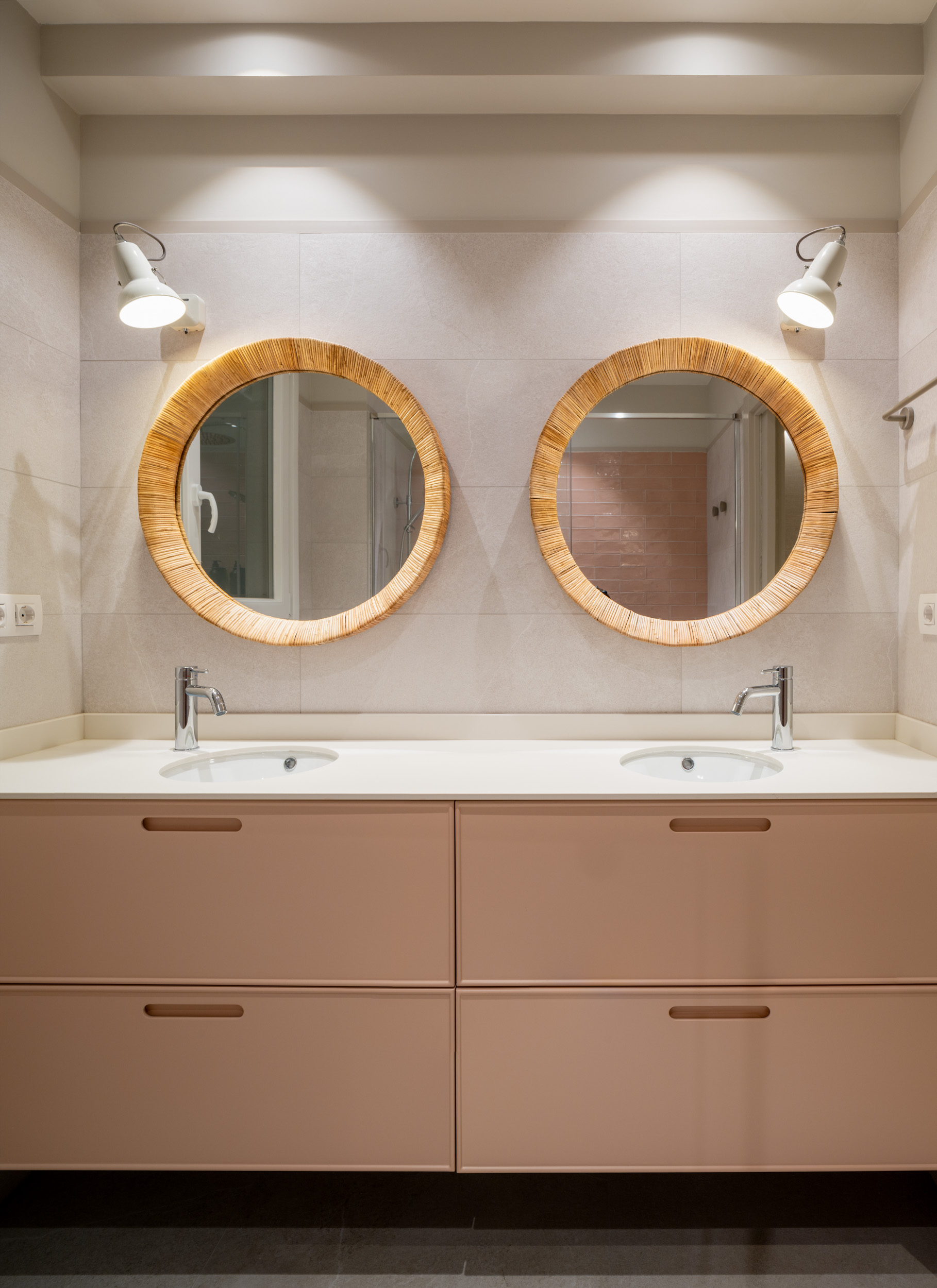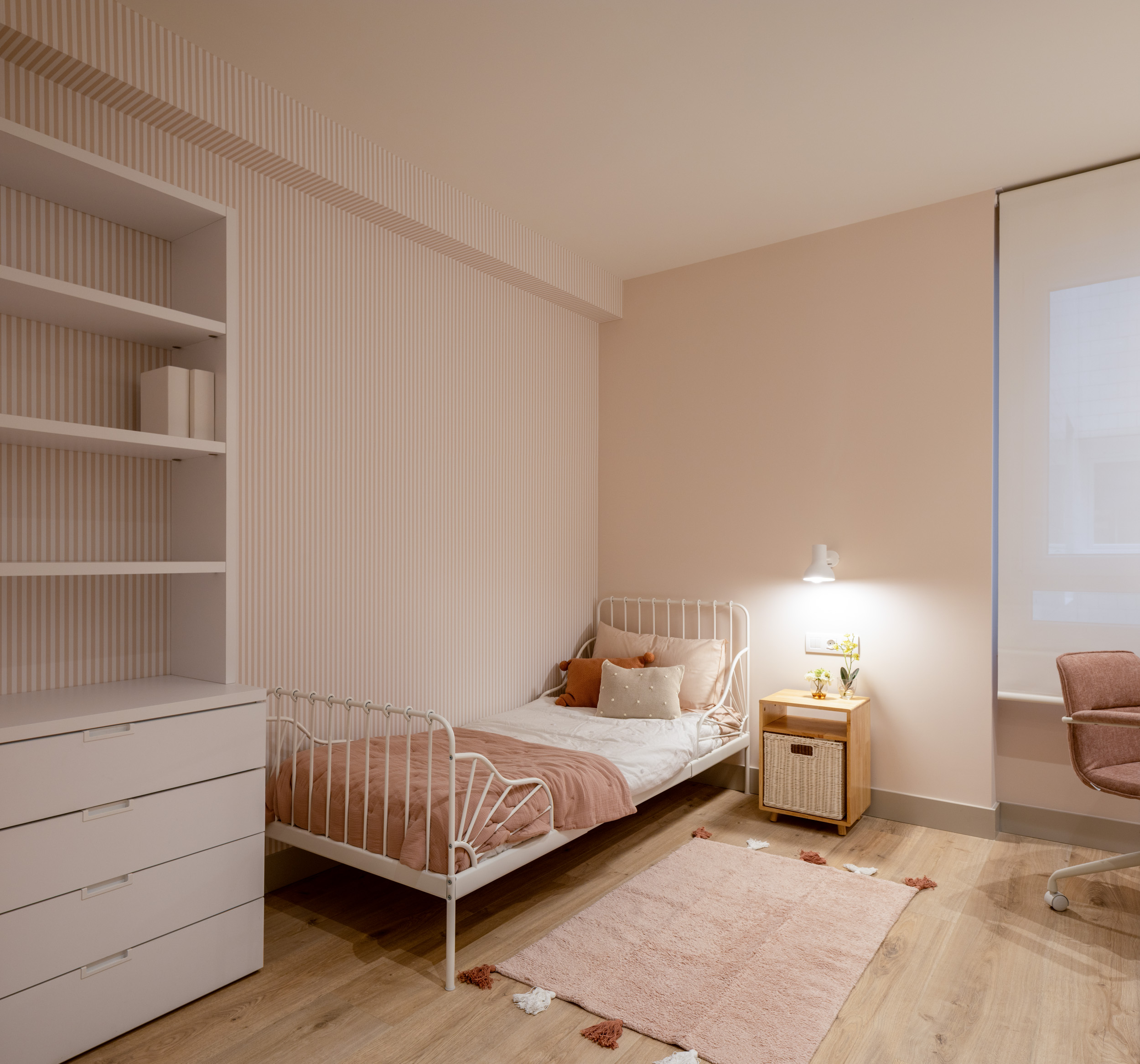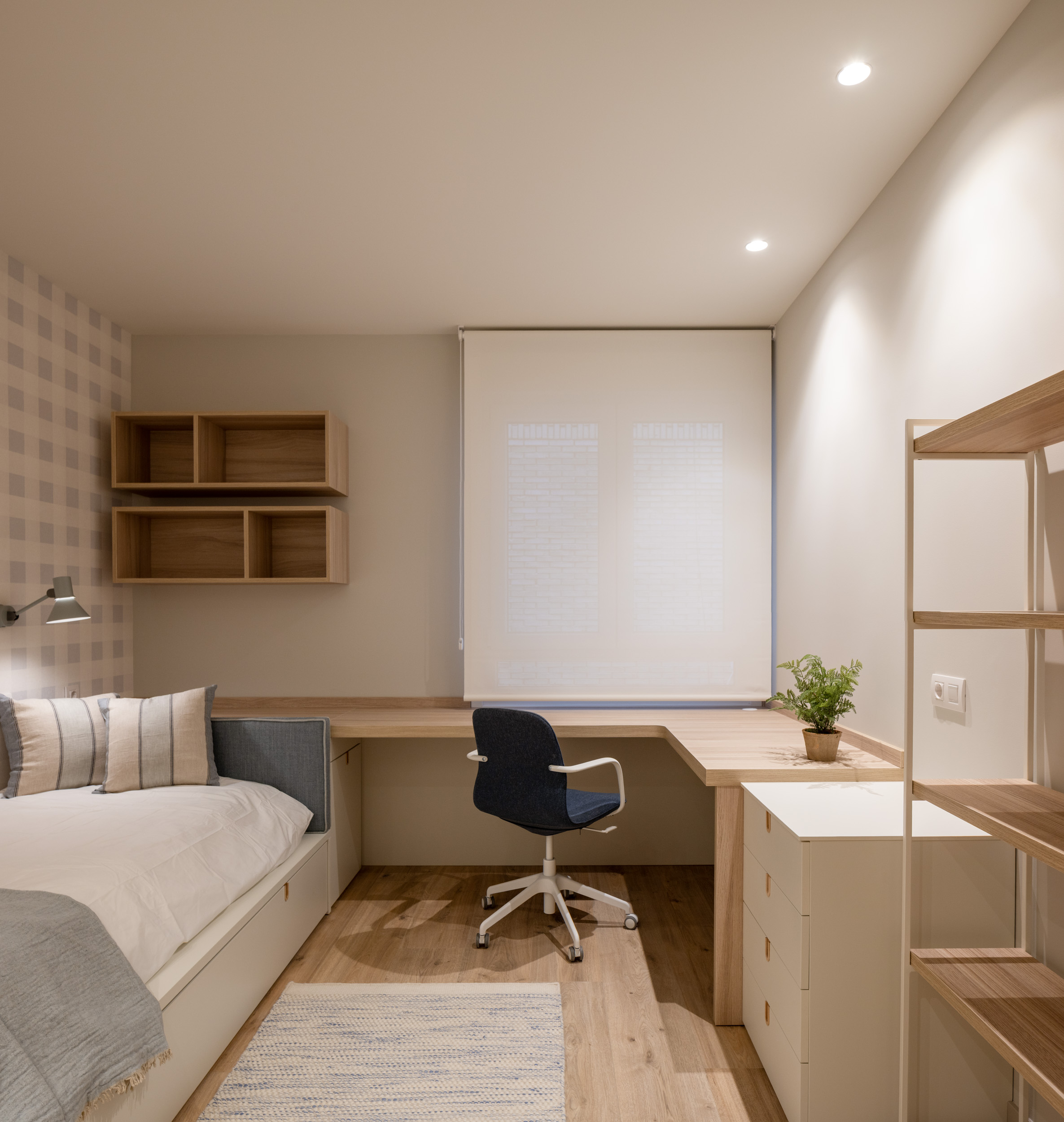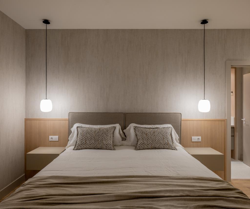 La iluminación fue uno de los ejes clave del proyecto. En colaboración con Susaeta Iluminación diseñamos un plan lumínico que complementa la luz natural y potencia los volúmenes y materiales. Las luminarias empotradas y discretas permiten una luz uniforme general, sin romper la limpieza visual del espacio. Los puntos de luz indirecta, leds cálidos y lámparas decorativas crean ambientes acogedores en salón y comedor. La iluminación puntual en zonas de trabajo —cocina, mesa de comedor, cocina, dormitorios— asegura confort y funcionalidad.