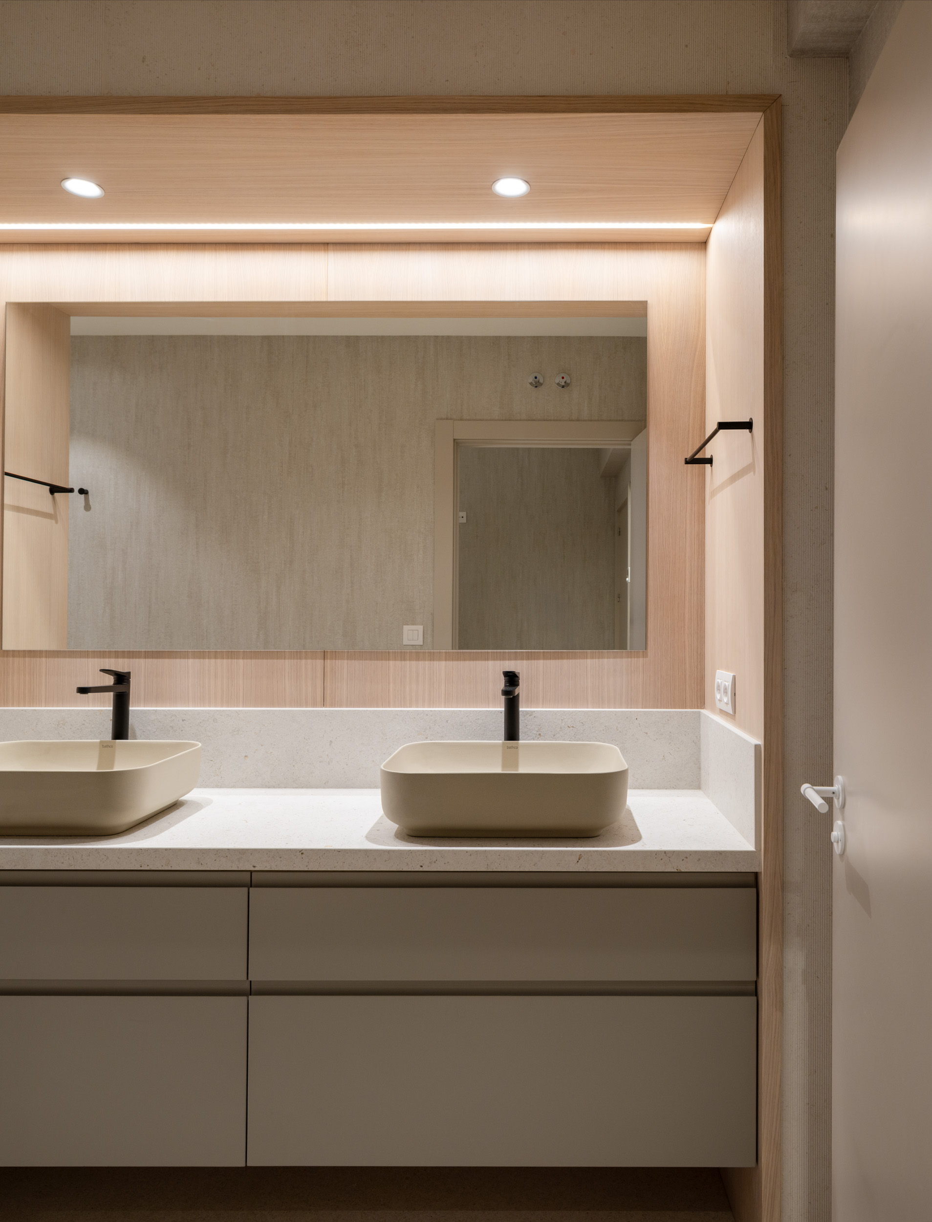 La paleta de color elegida gira en torno a tonos claros —beige, gris suave, blanco roto— que aportan serenidad y luminosidad. Los muebles y acabados en madera natural suman calidez interior, creando una atmósfera elegante, acogedora y equilibrada.