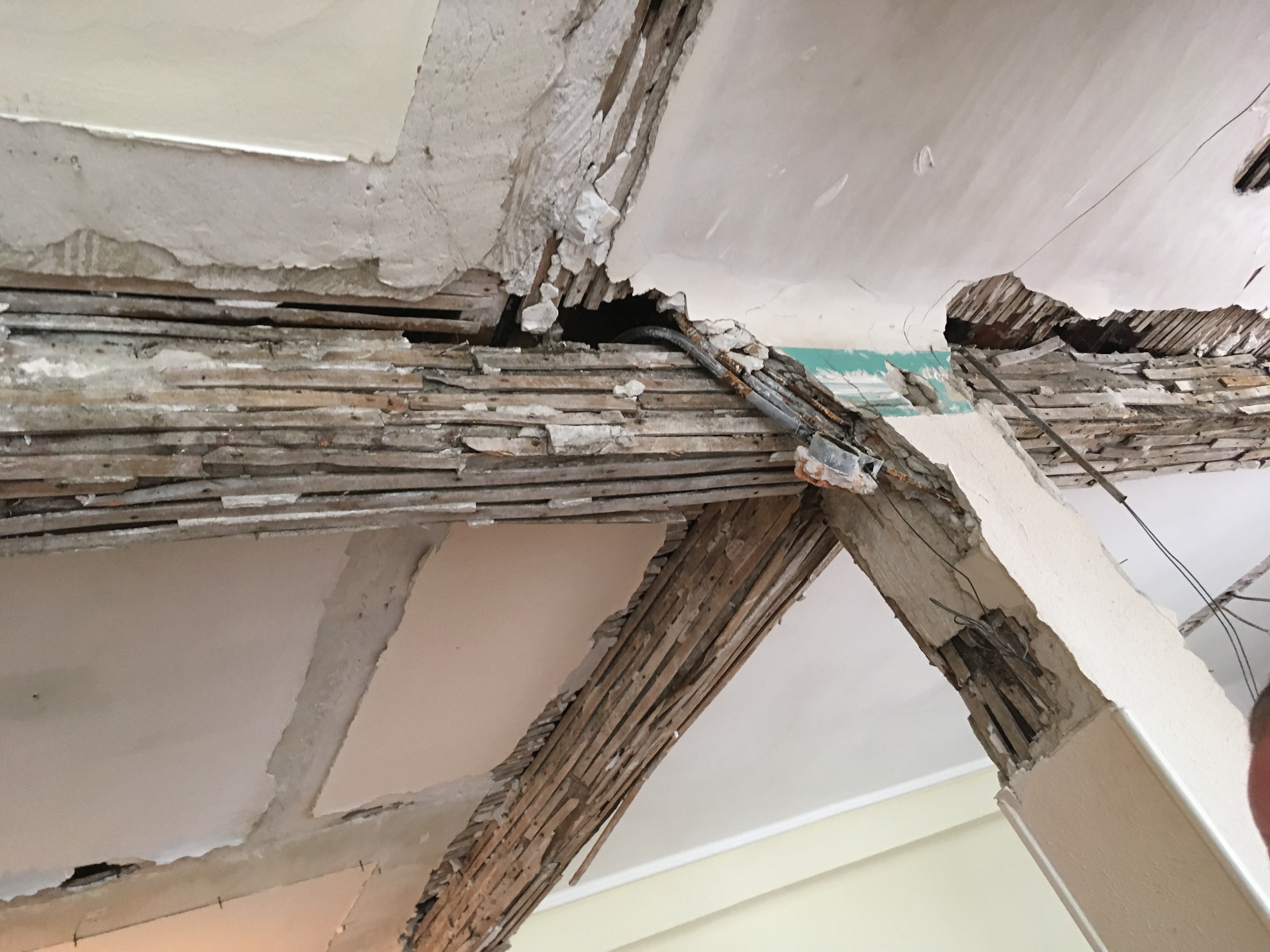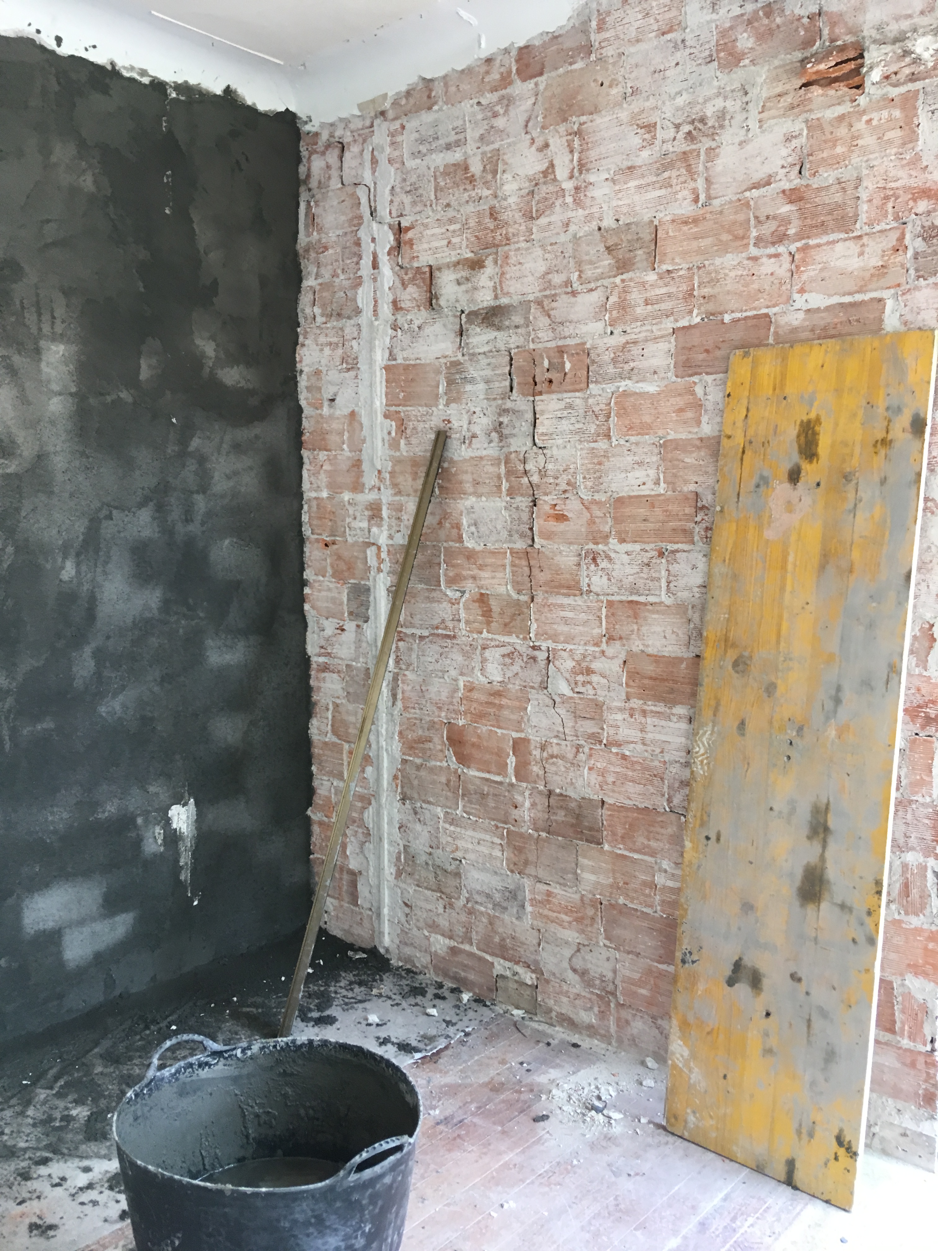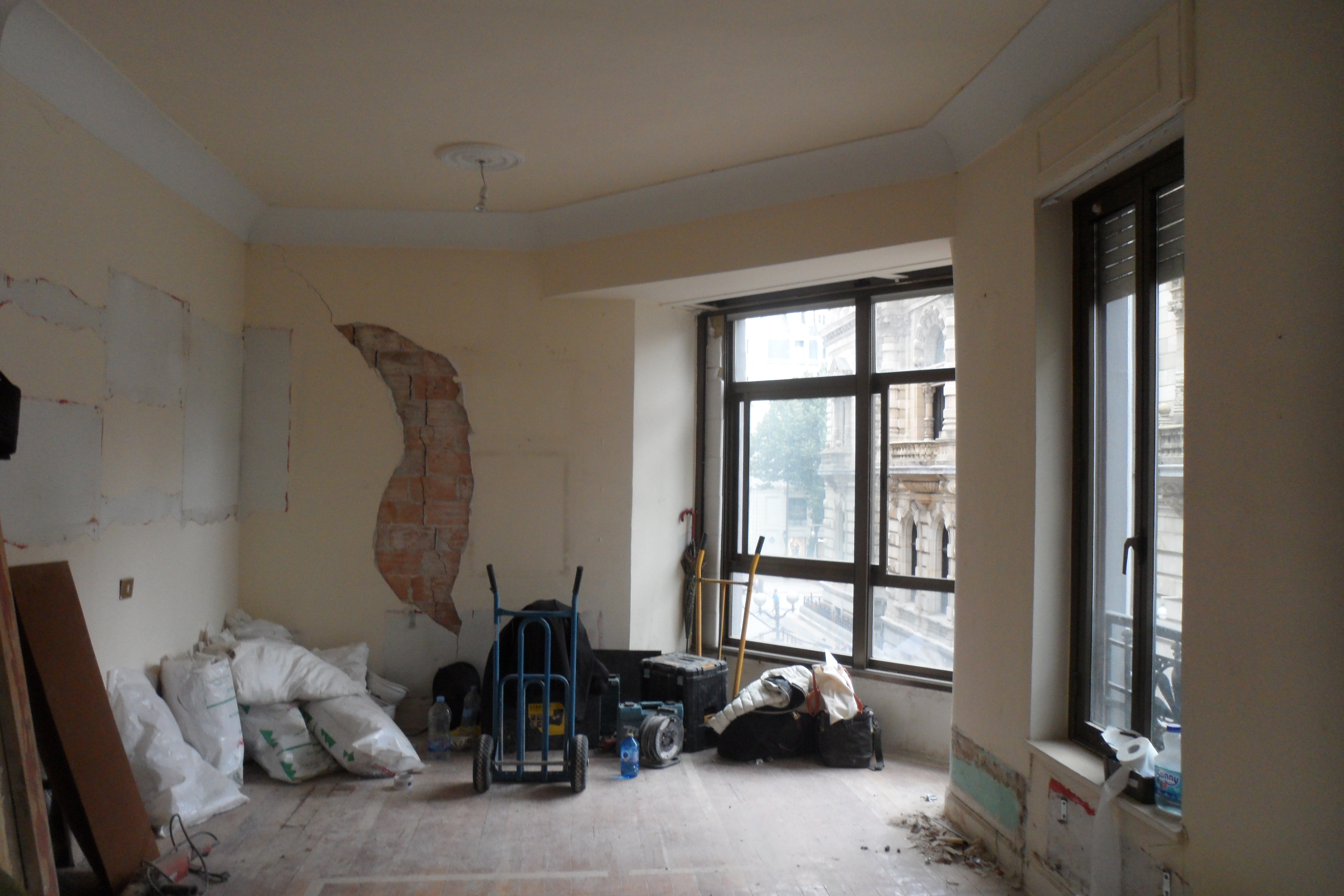 Pero aquí no terminaron las dificultades, como tenia una estructura de madera y parece que la cercanía de la boca del metro le pudo afectar cuando se ejecuto, después de obtener la licencia, nos dispusimos a efectuar las demoliciones y las sorpresas no dejaron de aparecer, grietas, fisuras, tabiques que se caían encima del de los vecinos, las ventanas que estaban colgando y que presentaban un peligro a la hora de sustituirse, etc. Vamos, un lio….